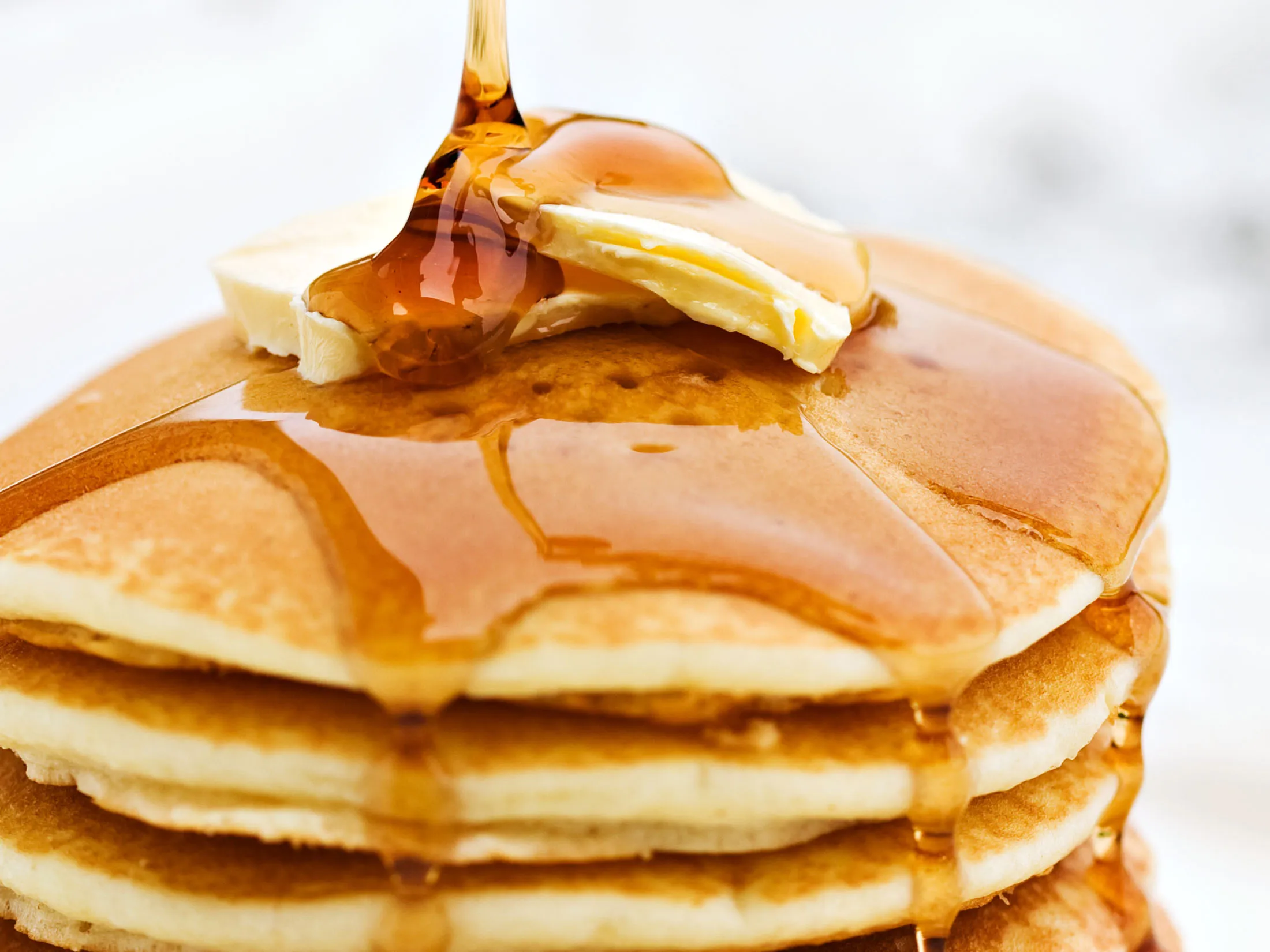 Fluffy pancakes drizzled with pure Canadian maple syrup and butter.