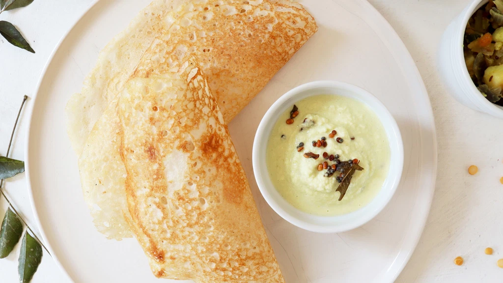 Crispy rice crepe stuffed with spiced potato filling, served with coconut chutney & sambar.