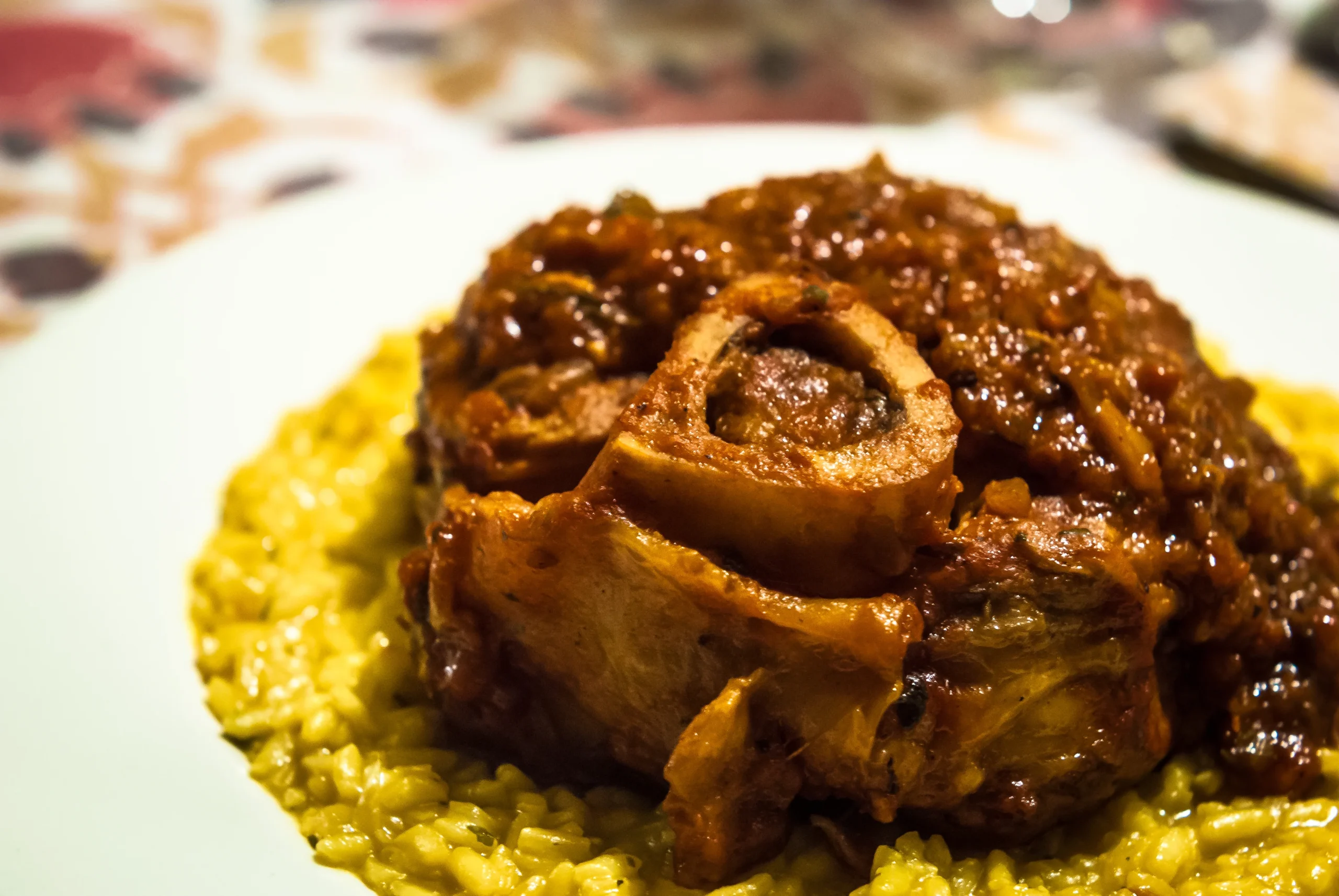 Braised veal shank in wine-tomato sauce, served with saffron risotto.