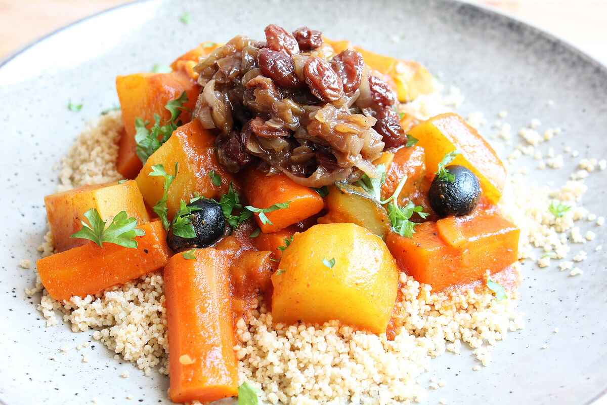 Slow-cooked chicken with apricots, almonds & preserved lemon, served with couscous.